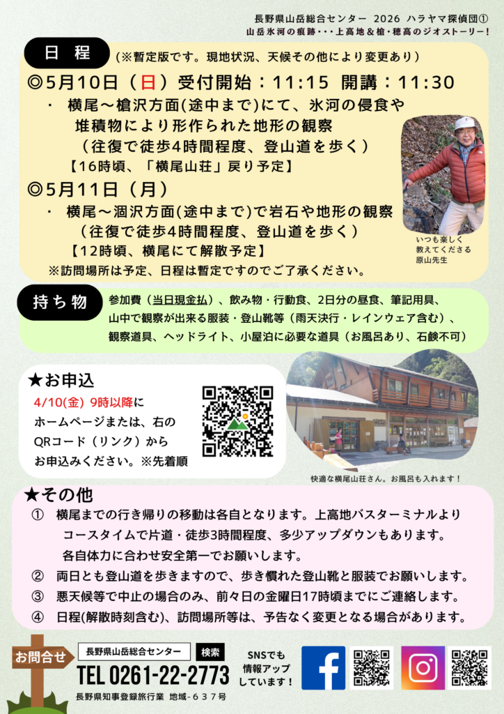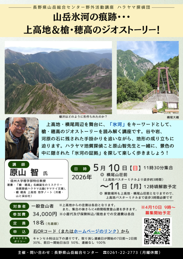 新年度の第一回は、上高地・横尾周辺を舞台に、「氷河」をキーワードとして、槍・穂高のジオストーリーを読み解く講座です。