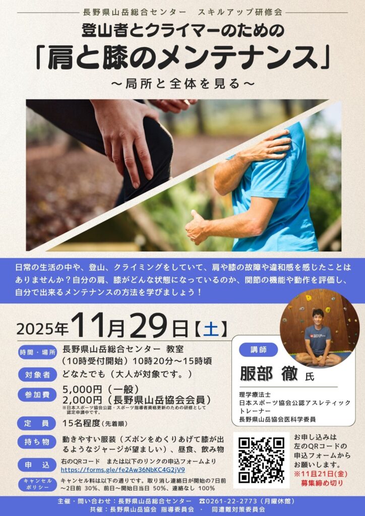 日常の生活の中や、登山、クライミングをしていて、肩や膝の故障や違和感を感じたことは ありませんか?自分の肩、膝がどんな状態になっているのか、関節の機能や動作を評価し、 自分で出来るメンテナンスの方法を学びましょう!