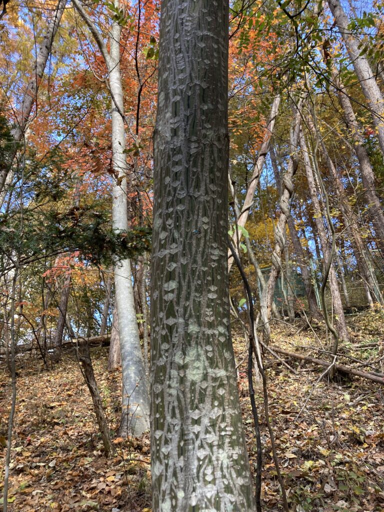 ↓「ウリハダカエデ」の特徴的な樹皮。