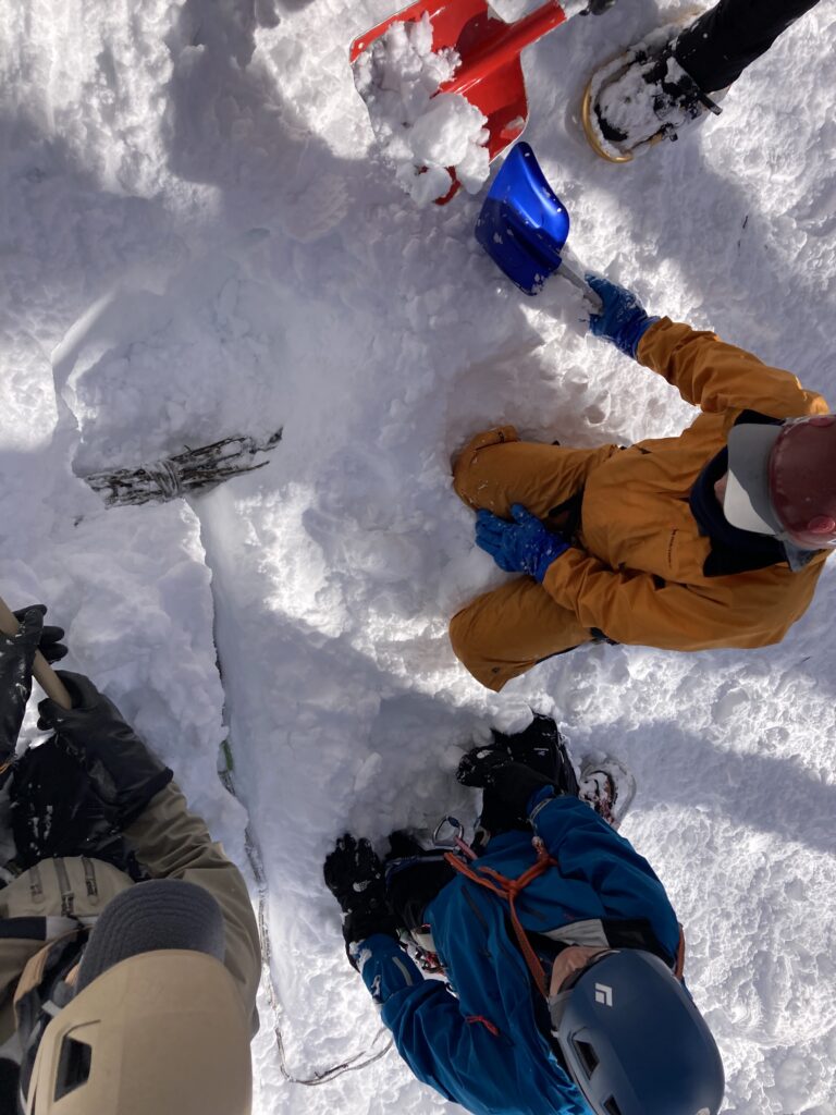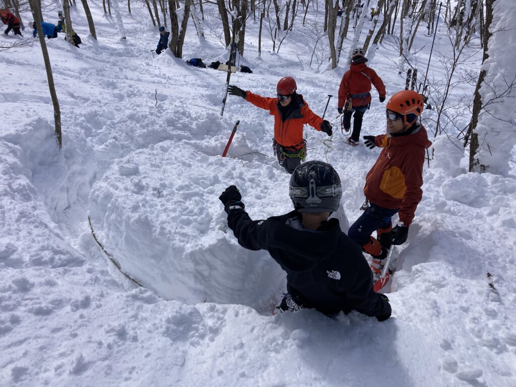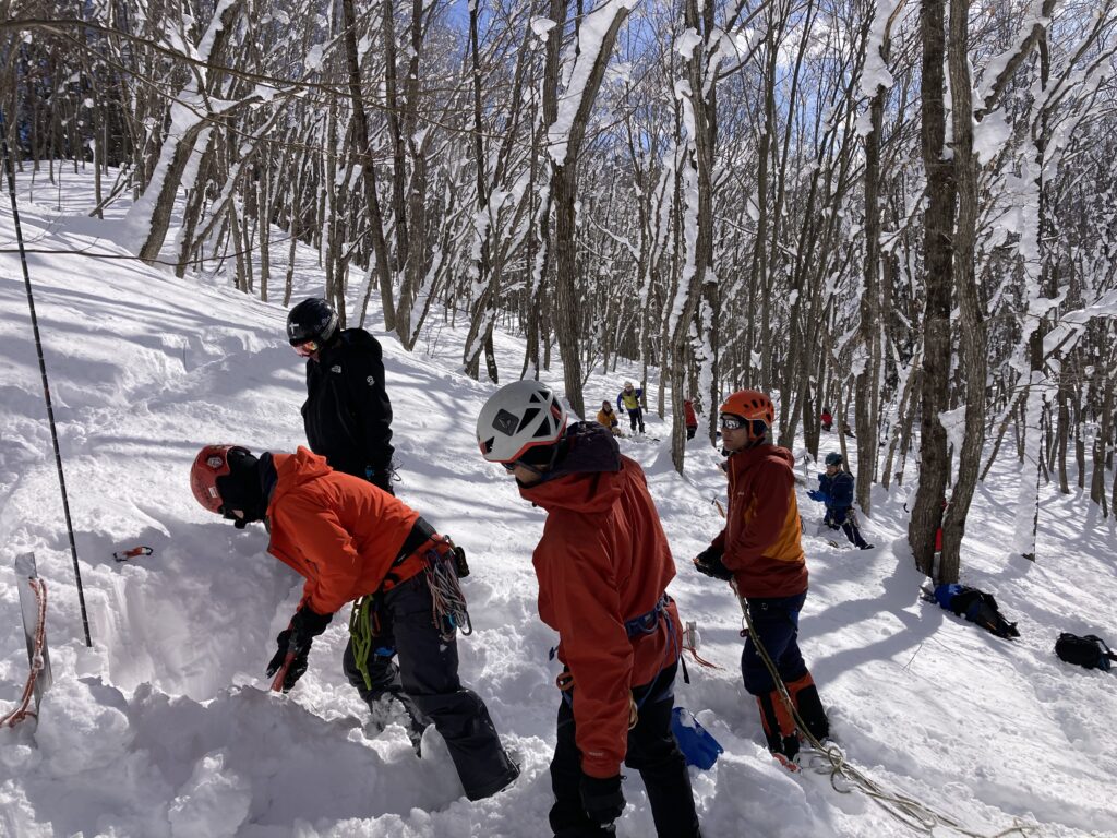 いろいろな雪上支点を構築するだけでなく、斜度や荷重強度、埋没深など様々に条件を変えて、支点強度を検証していきます。