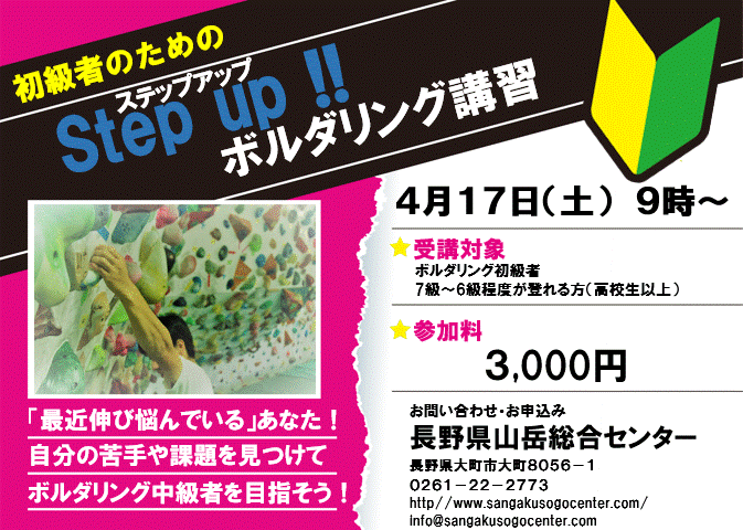 4月に初級者のための「ステップアップ!ボルダリング講習」を開催します。