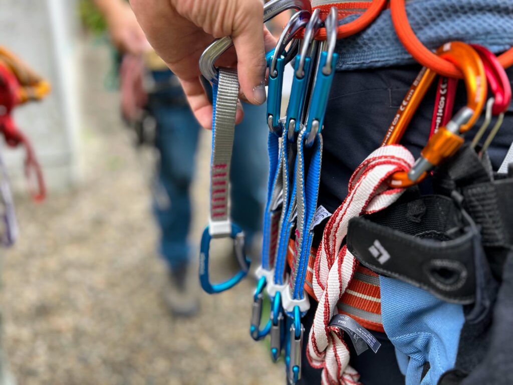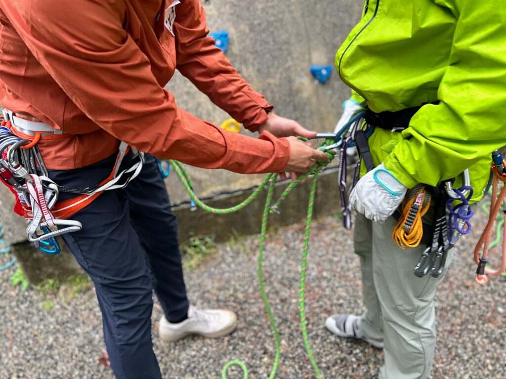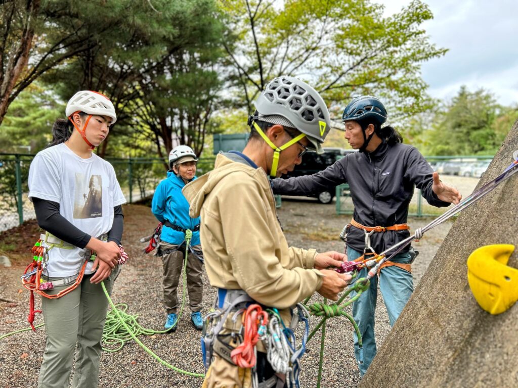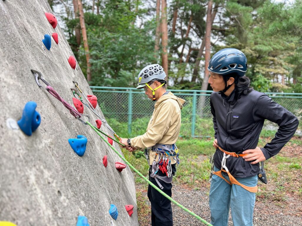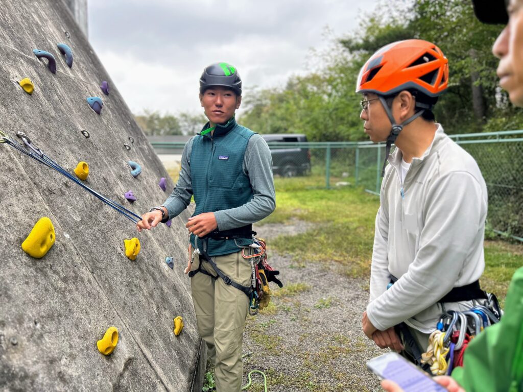 マルチピッチクライミングの技術を人工壁と自然の岩場で実践的に学ぶ講習会「マルチピッチクライミング教室」の1回目が大町市運動公園の人工岩場で開催されました。当日は所々雨が降る不安定な天候でしたが、予定通りのメニューが実施できました。